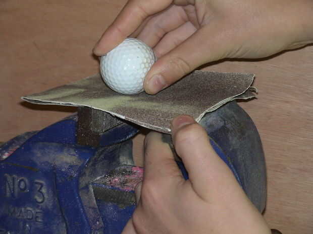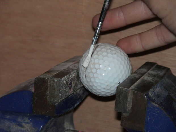 Para repintado la pelota de golf, tomar un papel de lija y pulir cuidadosamente los bordes, causados por el pegado - hasta que quede completamente lisa. Luego tomar algunos pintura blanca a base de aceite y darle una capa ligera en la marca de corte. Seguir aplicando capas de pintura hasta que funde.