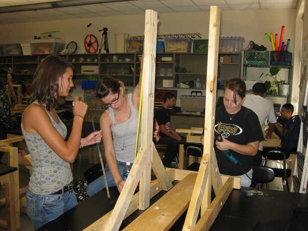 5) Coloque las restantes 4 pies largo 2 x 4 entre los dos tableros verticales, alinee los tres orificios y colocar la barra en.