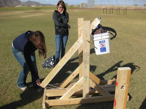 3) carga de la eslinga con la que quieres lanzar - en nuestro caso, una pelota de golf. Asegúrese de que el cabestrillo se tira todo el camino de regreso por lo que la inercia del tiro será mantener la bola en el saco. Coloque el lado del colgante de la eslinga con el anillo en el clavo.