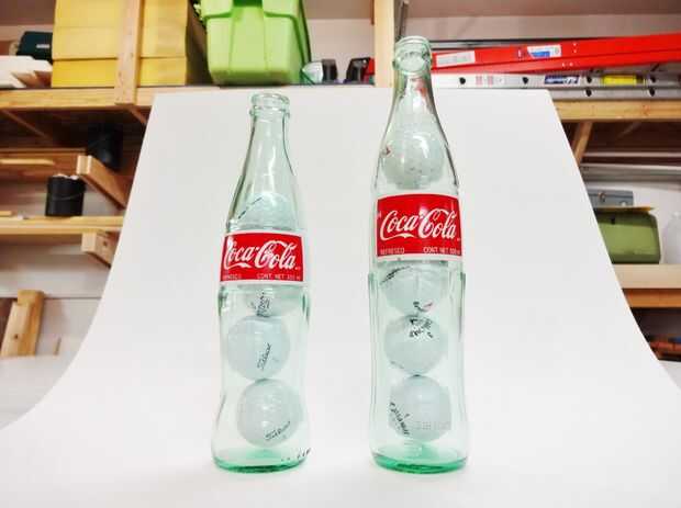 Una botella de 355 ml contiene cuatro bolas de golf, y una botella de 500 ml tiene cinco.