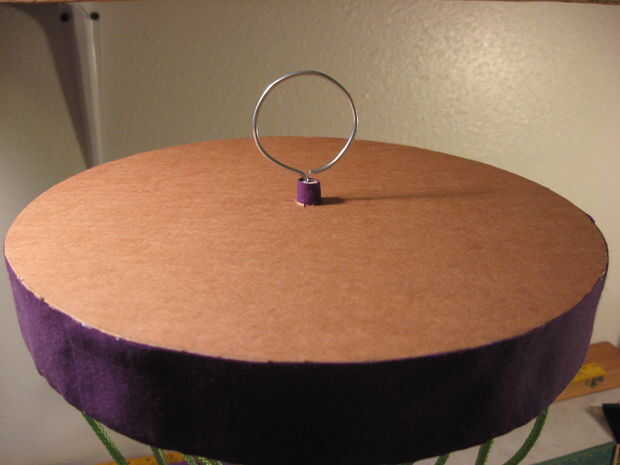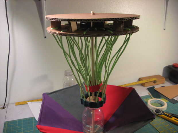 En ambos discos de cartón, hacer unos X lo corta el centro de la espiga vertical ir a través. Corte diez pedazos de cartón que son 1 por 1 pulgada cuadrada. Cuatro de estas justo al lado del agujero central del disco pegue con cuerdas de atado. Éstos actúan para mantener el disco perpendicular a la espiga. Pegar este disco a la espiga vertical, dejando aproximadamente 1/2" de taco que. Pegue las otras seis piezas de cardbaord en este disco para actuar como espaciadores para mantener el segundo disco paralelo a la primera. Ahora pegue el segundo disco en la parte superior.