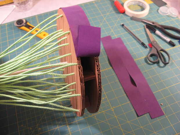 El cartón que utilicé era 1/4" densamente, por lo que el espesor total de la cartulina los discos con separadores entre 1 1/2". Corte unas tiras largas de tela de 1 1/2" de ancho y pegan cuidadosamente para cubrir la abertura entre los dos discos.