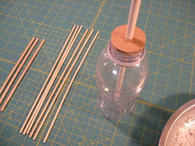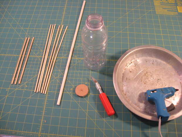 Corte una espiga 5/16" o 1/4" por lo que es de 18 pulgadas de largo. Trace la botella de apertura en alguna cartulina y recortar la forma de disco resultante. Utilice su mejor juicio para cortar un par de X cortes en el centro del disco de cartón. Esto actuará como un anillo de centrado para el pasador de 18". Pegamento la parte inferior de la espiga hasta el interior centro de fondo de la botella y pegamento de la cartulina del disco en la parte superior de la botella de agua, con la espiga que a través de él.