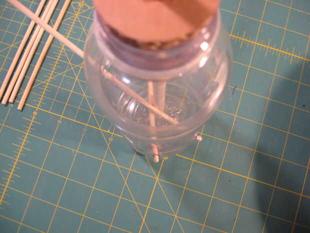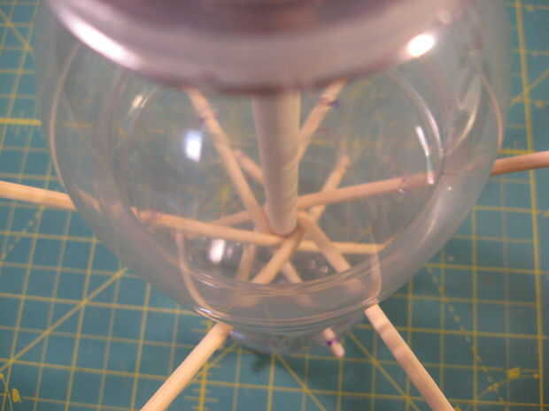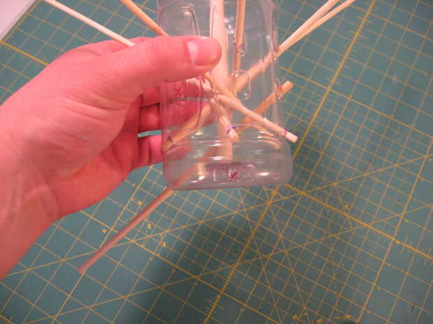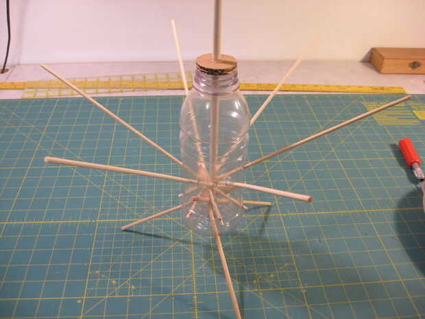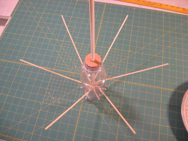 Ajuste las patas del trípode como sea necesario para que la espiga vertical está perfectamente recta. Poner pegamento caliente en cada pincho y el pasador de entrar o salir de la botella. Mi pistola es una pistola de temperatura baja y derritió el plástico un poco, así que ten cuidado si estás usando una pistola de pegamento de temperatura alta.