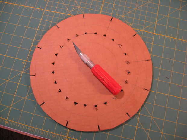 Marque el círculo de radio de 3" cada 15 grados. Utilizando un cuchilla corte un pequeño agujero en cada marca.