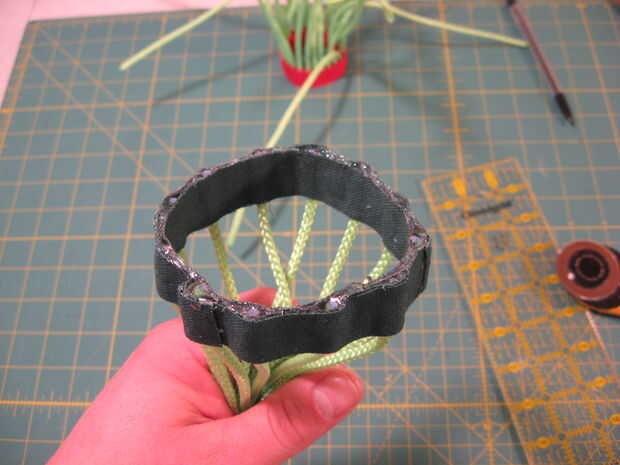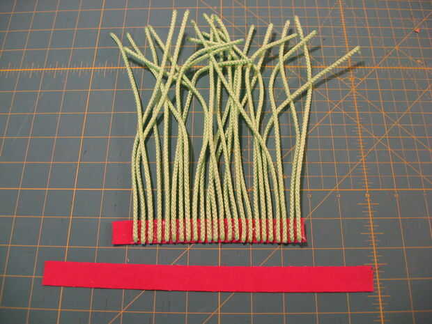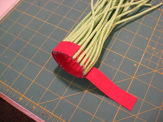 Las 24 piezas más cortas de la cuerda se deben pegar a una de las tiras de 8 pulgadas de tela. Espacio de aproximadamente 1/16 de pulgada, asegurándose que los extremos son todo incluso con la parte inferior de la tira de tela. Envolver la tira de tela en forma de anillo, con las cuerdas mirando hacia afuera y pegar juntos (como en las fotos). Pegue la tira adicional de 8 pulgadas de la tela por la parte exterior, sellado de las cuerdas dentro de un anillo de tela.