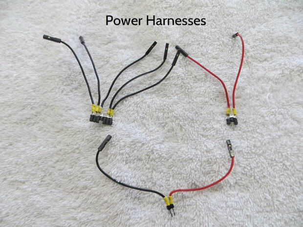 Para realizar los arneses de poder "bus bar", usaba una pieza vacía del plástico de la cabecera para recibir las clavijas que previamente soldada a los saltadores femeninos, pero dejé un perno en el centro que conecta con el conector de energía correspondiente de arduino. Inserta las clavijas de puente en el plástico y entonces envuelto un pedazo corto de alambre desnudo alrededor de los pernos y soldadura puente los pines juntos. Para los arneses de arduino, yo simplemente reutilizar el plástico portador para "juntar" las clavijas.