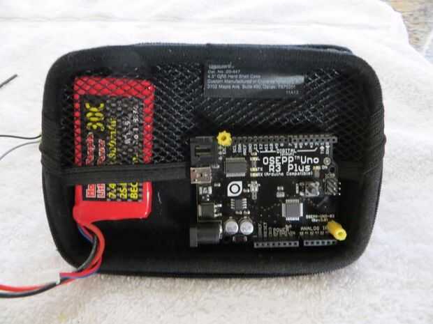 El batería se desliza en un poco de malla bolsa que formaba parte de la caja y puse un pequeño buffer de espuma entre la batería y el arduino. Todo está sólidamente en su lugar y naderías "sonajeros".