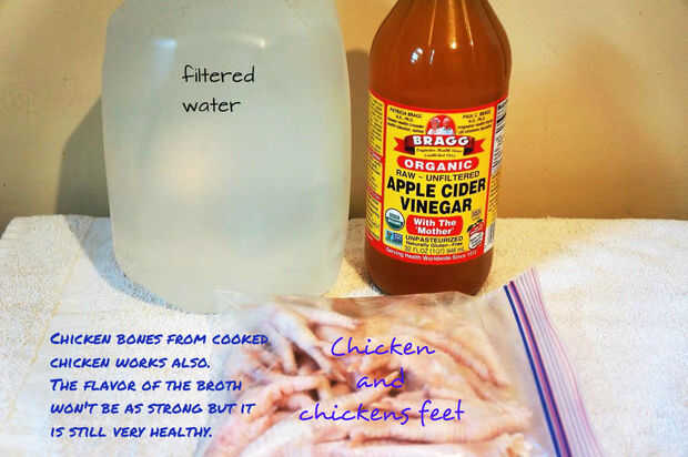 Pollo orgánico con huesos (y los pies de pollos si usted puede encontrarlos.) Puede utilizar los huesos del pollo que ha sido cocinado. El sabor del caldo será un poco más débil. Guarde todos los huesos de pollo y congelarlas hasta que tenga suficiente para hacer un pote completo de caldo de pollo.