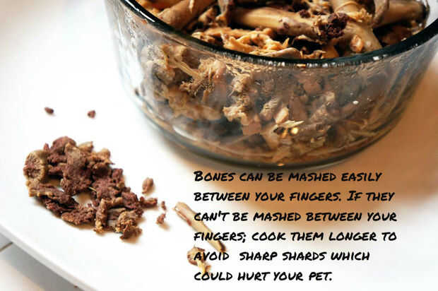Coloque los huesos cocidos en una licuadora o procesador de alimentos o a mano el puré. Por favor preste especial atención a este proceso. Los huesos de pollo pueden tener puntas filosas que pueden dañar a su mascota si no se cocinan bien. A diferencia de los huesos de pollo regular, he notado que los huesos de patas de pollo toman mucho tiempo para cocinar hasta una harina suave. Triple pollo los huesos para asegurarse de que ha cocinado lo suficiente para triturar con los dedos en una goma antes de colocarlos en la licuadora.