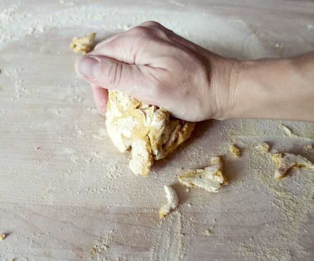 Aplastar a la izquierda sobre pedacitos de masa juntos y repetir el proceso de laminación. No te olvides de volver a enharinar la superficie de trabajo o se atranca sus poco chicos!
