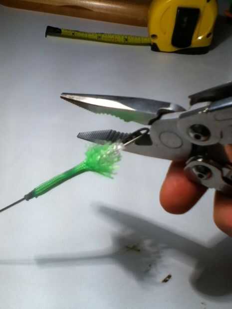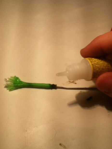 Tomar su clip y deslice con cuidado a través del molle. Mantener los filamentos internos de Paracord dentro de la carcasa de Paracord. Tome su encendedor y chamuscar el final del molle. Puede utilizar sus pinzas a forma el Paracord derretido. A continuación, tome la pinza y cortar el extremo de la presilla el. Puede que necesite volver a colocar el clip. Luego tomar algunos pegamento y coloque una gota del mismo en el Paracord y clip para fijar juntos. Deje que el pegamento fijar.