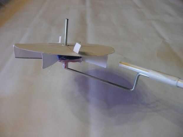 Pone la turbina en el árbol. Soplar a través de la paja. ¿Convierte? El golpe no debe llegar en el árbol, pero en medio de las hojas. Si es necesario, doblar el alambre de metal.