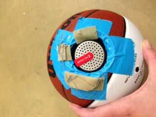 Deslice con cuidado el tubo de su altavoz. Se ha añadido un trozo de espuma en la parte inferior para proteger el altavoz. Ahora corte un trozo de tela para cubrir el agujero. Poner 3 piezas de velcro alrededor de la bola y luego fije a la tela.