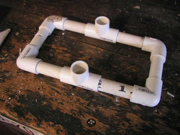 Usar 6 3" largos tubos de pvc, 4 codos y uniones en t 2 para construir la base. Después de montarlo, cortar un pequeño corte en uno de los finales 3". Esto mantendrá su fútbol.