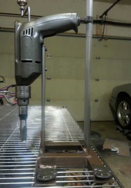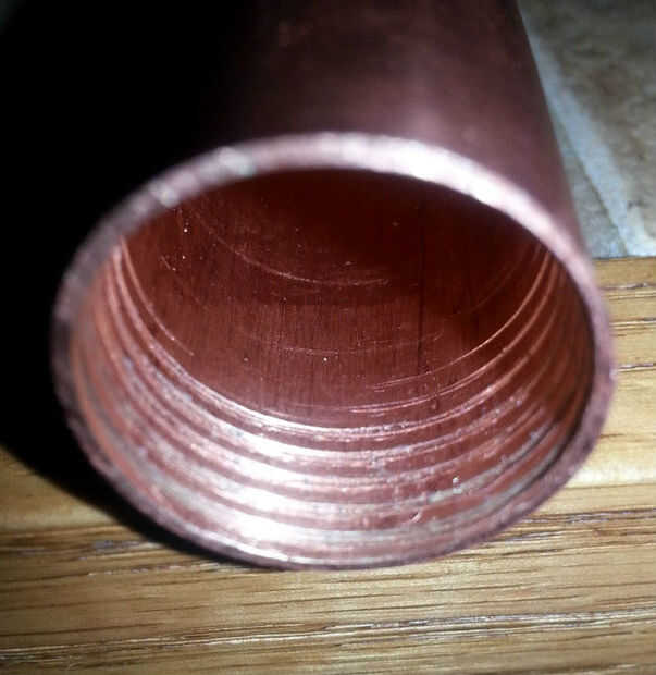 La máquina tapping también fue beneficiosa para un tubo de cobre para que acepte 1/2" NPT hilos de rosca del enchufe cobre amarillo que golpean ligeramente. El tubo de cobre fue montado usando mi Simple dentro de la abrazadera. La caja de engranajes en un taladro de 3/8" típicos tales como esto no se hace para manejar la cantidad de esfuerzo de torsión necesario para un grifo de este tamaño. Sin embargo, he podido conseguir el grifo iniciado y terminar con un trinquete de 3/8".