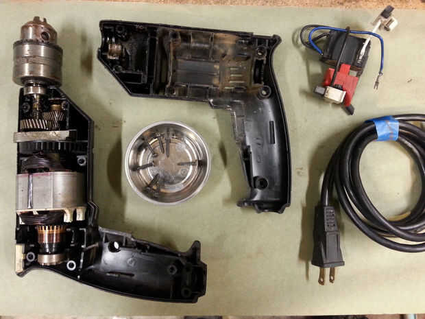 Quite los tornillos de su taladro y guardarlas para más adelante. Separar a los dos ricos del cuerpo. Sacar el cable y todos los componentes eléctricos internos. Estos pueden ser desechados o guardados para otro proyecto.