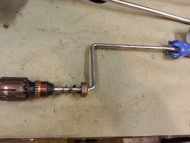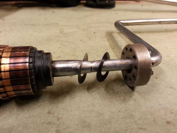 Corte del rodillo de pintura como se muestra. Coloque el cojinete trasero del motor y las arandelas en el rodillo de pintura. Cuidadosamente Alinee el rodillo de pintura con el eje del motor y soldar los dos trozos juntos. Moler la soldadura para permitir el rodamiento se deslice hacia atrás en el eje del motor. Crear una transición suave entre los dos ejes para prevenir grietas de tensión.
