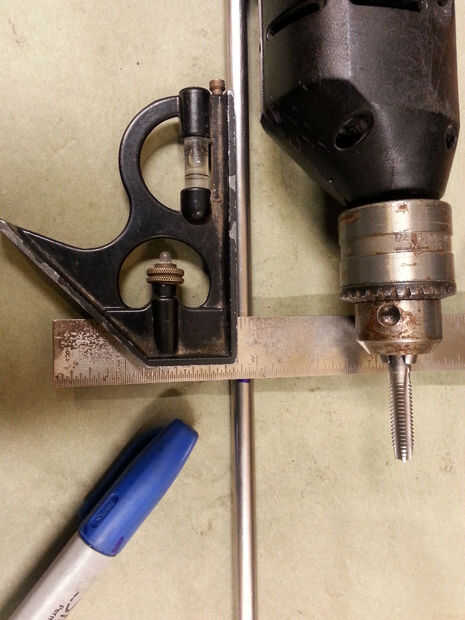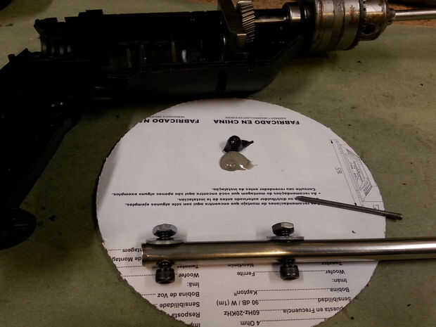 Separar la carcasa en dos mitades. Inserte los tornillos en el acero redondo, añadir dos arandelas y dos tuercas. Uso JB Weld para sujetar las arandelas y tuercas a la vivienda. Poner un poco larga y recto en el mandril. Mida la distancia entre la punta y el acero redondo cerca de la vivienda y en sus extremos. Ajustes necesarios para asegurarse de que son paralelas. Alinee el acero redondo con la broca por el ojo antes de permitir que el JB Weld establecer.