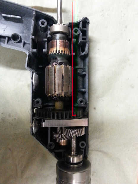 Mueva hacia atrás el conjunto de engranajes en la caja del taladro. JB de soldadura la raya a un lado de la caja del taladro.
