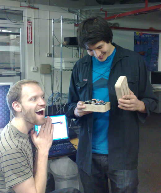 Lo que está dentro de ese exterior de caoba rico? Arduino que lee las vibraciones de un sensor piezoeléctrico y transmite información con un solenoide golpeando contra la tapa resonante del bloque. Todo es accionado por una o dos baterías de 9V.