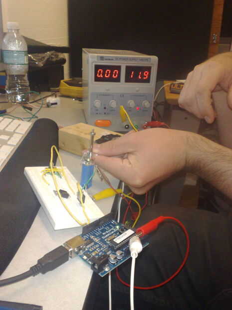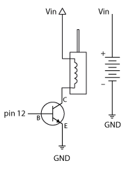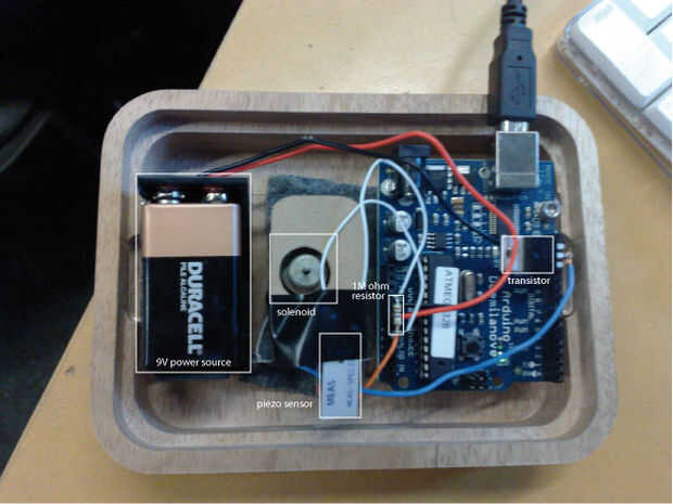Usted necesitará conseguir un transistor de alta corriente (hemos utilizado un TIP31C) para actuar como un interruptor para el solenoide - si está conectado directamente con el Arduino puede restablecer todo cada vez que activa, ya que dibuja demasiado actual para la Arduino a la fuente. Entonces el Arduino es sólo la base encendiendo y apagando, y el circuito de colector/emisor proviene directamente de los 9V. El solenoide que utilizamos fue diseñado para 12V pero tiene cierta tolerancia para tensión menor a costa de golpear volumen.