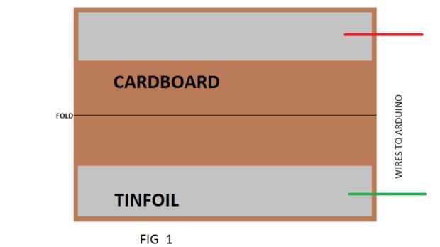 La pieza de cartulina, doblada por la mitad, es el objetivo que golpearía eventualmente con la bola. En la posición natural, las dos aletas quedaría "abiertas", es decir, hacen una forma de V. Cuando la bola golpea, las aletas se cerrarán. Usted se colocar el estaño en el interior de las dos aletas que hacen un contacto cuando se cierran las solapas. Cuando las aletas de cierran y los pedazos de papel realizar un contacto, Ardunio obtiene una señal que se utiliza para ajustar la partitura.