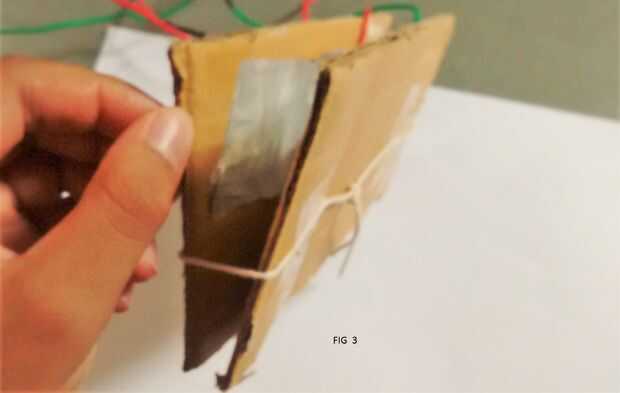 Paso una) tomar la 2 cortar pedazos de papel de estaño y pegarlas a los dos extremos de la cartulina con cinta adhesiva. Asegúrese de que usted pegar el tinfoils en la misma cara de la cartulina, sino dos extremos opuestos - de tal manera que si el cartón se dobla por la mitad y presiona, las superficies de papel de dos estaño tocándose unos con otros (ver fig1).