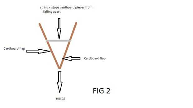Paso c) doble la pieza de cartón por la mitad (para asegurar las tinfoils están "dentro" y pueden tocarse cuando presiona) (ver fig1). Ahora, queremos asegurarnos que en su posición natural, las dos aletas quedaría "abiertas", es decir, hacen una forma de V. Hacerlo utilizando un trozo de cuerda. Simplemente libremente puede envolver alrededor de la cartulina doblada y pégalo con la cinta para que no salga. Asegúrese de que el tinfoils no toquen cuando la cartulina doblada queda en su posición natural. Asegúrese que las aletas cierran haciendo los tinfoils toquen cuando una pequeña fuerza es aplicada (como cuando se golpea con la bola) (ver fig2, fig3).