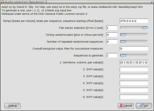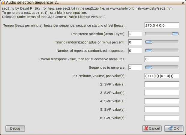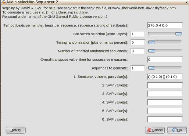 Haga doble clic para seleccionar la primera pista del tambor. Luego voy a efecto... ¿1 plugins? ... Secuenciador de audio selección dos. Entrar en un tempo. Latidos por secuencia debería ser "4". Transposición de valor, luego de sucesivas medidas debe ser "0". Secuencias para generar debe ser "1". Tipo en los valores de volumen y tono de la cacerola (SVP), serán el patrón del tambor.