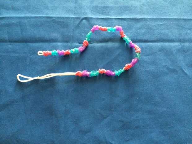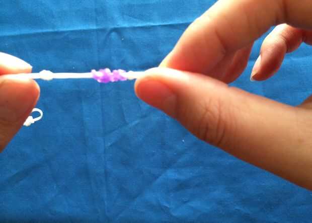 Para hacer los "granos" una banda (azul, rosa o púrpura) en bucle continuamente alrededor de la banda blanca del esqueleto en una pequeña sección. Continúe añadiendo más bandas de grano como se muestra. Cuando la pulsera de cuentas caben libremente alrededor de su muñeca, lazo el esqueleto blanco más largo a través del agujero blanco pequeño en el extremo opuesto de la pulsera hasta topar con el final de los granos coloreados como se muestra en la figura 3. Final los granos para que la longitud del esqueleto cuando la pulsera irá todo hacia la mitad del dedo y el lazo alrededor de él. Agregar más bandas blancas si es necesario.