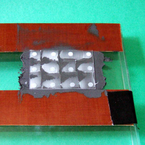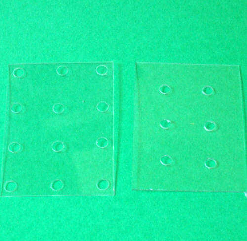 Las tres hojas conductoras se mantienen apartes por aisladores espaciadores. Empujando entre los espaciadores crea una trayectoria conductora. Los espaciadores aislantes son los puntos blancos que son hechos por screeding Oogoo en los orificios de las galerías de símbolos. Las plantillas son hechas por taladrar la 1/4" lámina de plástico de 1/16". Los agujeros son taladrados 1" aparte con los orificios de la plantilla segundo perforados entre los agujeros de la primera.
