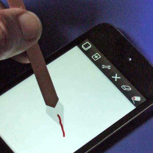 3 mezclar una pequeña cantidad de Oogoo II y se usa para pegar a la tela conductora hasta el final del mango. La aguja se utiliza encolado lateral para el bombeo de la goma conductora mantiene la placa de circuito de rayar la pantalla.