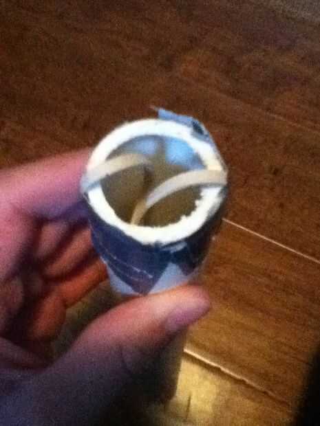 Gota de cadena a través de la tubería una cinta ambos extremos de la banda de goma al tubo. También poner la cinta en el centro de la goma elástica para sujetar la bola de acero.