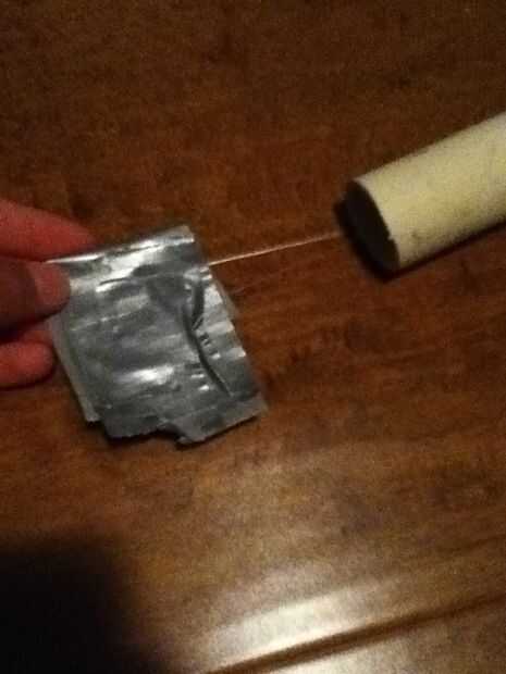 En el extremo de la cuerda poner pedazos de cinta sobre la otra. Esto no sólo actúa como algo para agarrar a, también no deja la cadena en el tubo.