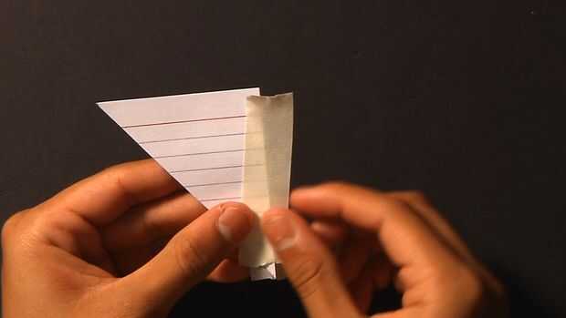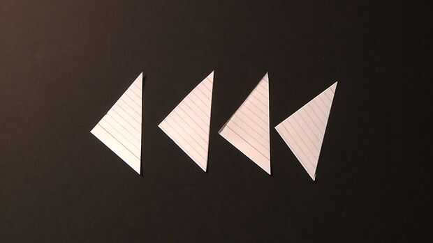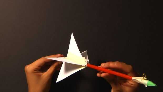 Fold the index card in half. Hacer un pliegue y despliegue. Corte a lo largo del pliegue. Use la regla para dibujar una línea diagonal a través de ambas piezas de la tarjeta. Corte a lo largo de las líneas así tendrás cuatro triángulos. Estas son las aletas del cohete. Coloque un trozo de cinta a cada lado del borde más largo, recta de uno de los triángulos. Pegarlo en el extremo opuesto de la paja de borrador de la tapa, alrededor de una pulgada de la punta. Repita los pasos para los otros triángulos por lo que están espaciados uniformemente alrededor de la paja.