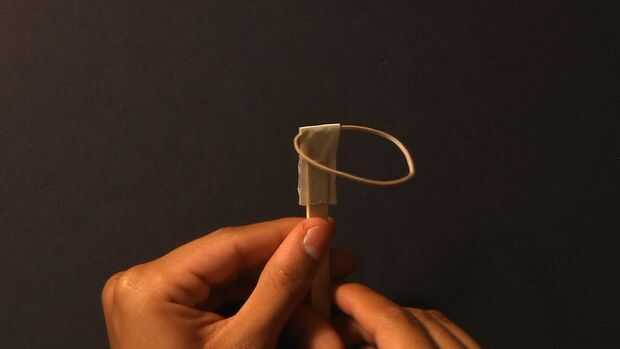 Cinta de goma a una punta del palillo artesanal utilizando dos trozos de cinta, uno encima del otro.