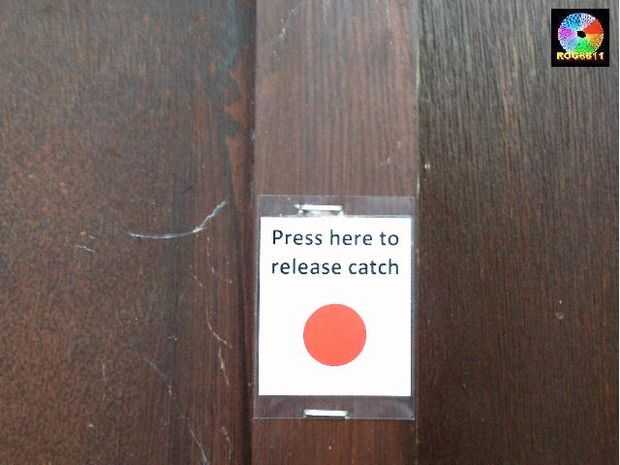 La solución era fácil, un tornillo extra sobre el gancho del pivote, una banda de caucho para levantar el gancho (un limpiador de pipa envuelto en cada extremo lo mantiene en la posición correcta) y una etiqueta pequeña que dice "Pulse aquí para desbloquear".