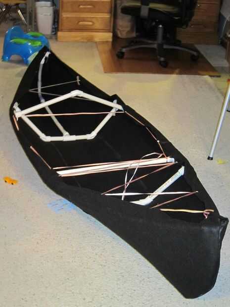 Reveló el fieltro negro ancho y puso el marco sobre ella. Luego rough-cut nuestro la forma simplemente tirando hacia arriba los lados y un par extra de corte pulgadas sobre la parte superior del marco. Luego cosí una costura para darme una capa de doble espesor para mejor mantener los ojos del remache. Yo atada encima de los ojos del remache en un patrón entrecruzado (similar a los cordones de los zapatos), para mantener la "piel" de la canoa del enseñado. En realidad terminó buscando muy bueno!