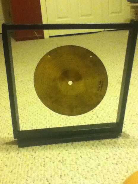 Ahora haga dos orificios en la parte superior del símbolo como se muestra, colocarla en el claro poliuretano (opcional para darle el brillo) y la pintura de aerosol negra a la caja y atar el símbolo a la caja con la línea de pesca. En realidad usé tornillo-ojos para atar a la madera. Para hacer un palo basta con tomar un palillo y cubrir el extremo con bandas de goma. Ahora que terminaste!