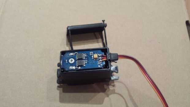 Cortar el conector en el extremo del cable del servo. Desatornilla los 4 tornillos en la parte posterior del servo y retire la placa trasera. Tenga cuidado de no perturbar las tripas en el proceso. Resbaló el zapato de alivio de estrés de goma el extremo del cable. Utilizando la Dremel, moler una muesca en la placa posterior del servo que puede pegar el cable recto hacia fuera la parte posterior. Vuelva a montar el servo.