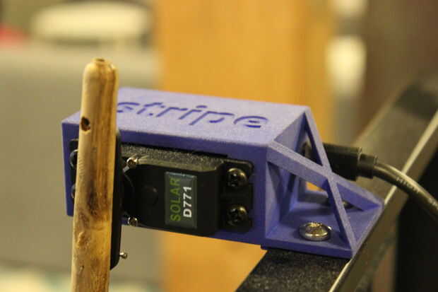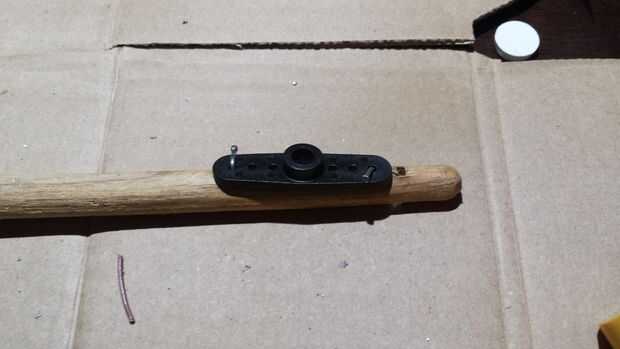 Encuentra el cuerno del servo recto y dos lados que viene con el servo. Taladrar dos orificios piloto pequeñas hacia el extremo del batidor. Los agujeros deben ser más pequeños que sus pequeñas uñas y espacian para alinearse con los agujeros más lejos apartes en el cuerno del servo. Los clavos a través del cuerno del servo de la alimentación y un martillo les la mayor parte de la manera en el batidor. Doblar el resto de las uñas alrededor del cuerno del servo para asegurarlo en su lugar. También usé pegamento caliente para ayudar a mantener las cosas Unidas.