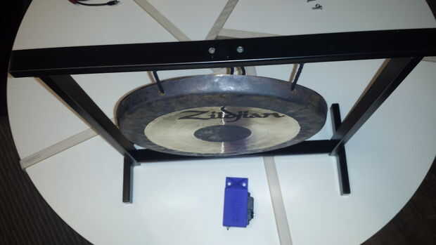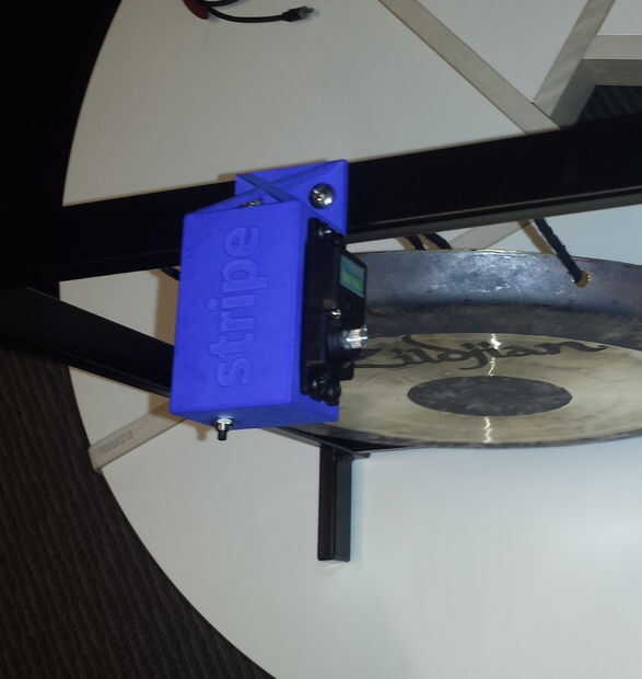 Perfore dos agujeros 10-24 en el centro del travesaño superior del soporte de gong. Puede ser útil utilizar el recinto para marcar la posición de los agujeros. Instale el Gongbot en el soporte con tornillos y tuercas de 10-24.