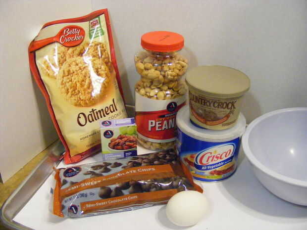 Esto es más conceptual y semi-scratch así que va a utilizar una mezcla de galleta hecha de antemano, agregar el maní y las pasas de uva y cubriendo las galletas al horno en chocolate.