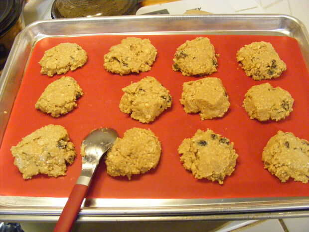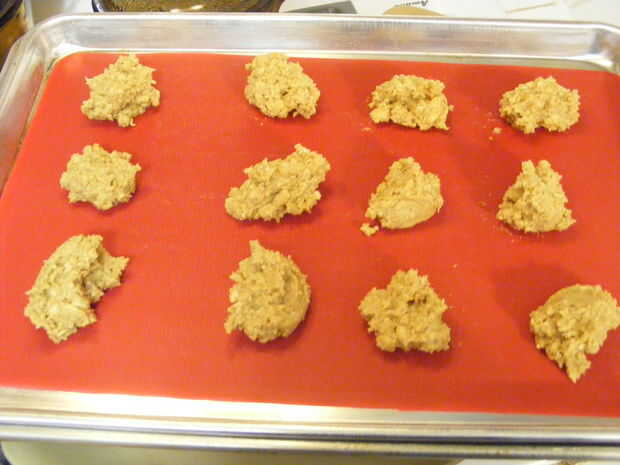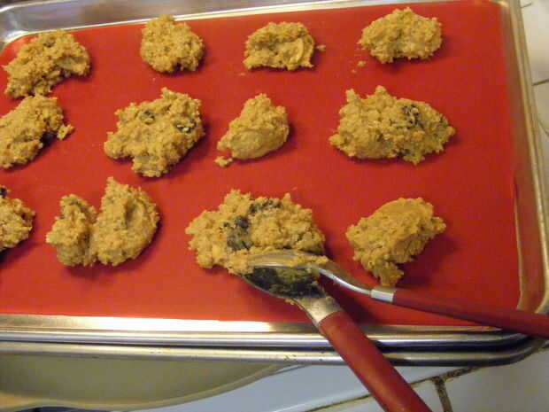 Mojar la cuchara para evitar que se peguen a la masa y suavizar un poco las formas de galletas. Todos ellos un poco del derretimiento en un blob así desea hacerlo así se cocinan uniformemente.
