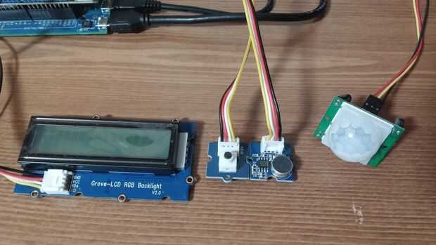Primero - tomar cuatro cable y surco-LCD, botón, sensor de los sonidos del Grove Starter Kit y preparar el sensor PIR.