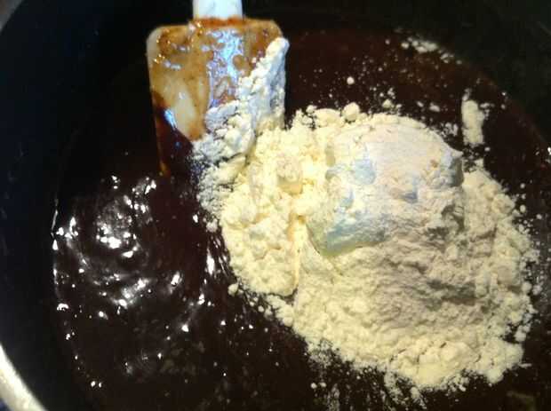 Ingredientes:185g de mantequilla sin sal cortada en cuboschocolate negro 185g (sólidos de al menos 70% de cacao)85g de harina40g cacao en polvo3 huevos grandes175g de azúcar extrafino dorado75g de turrón de almendras (yo tengo la mía de un pick n Tie