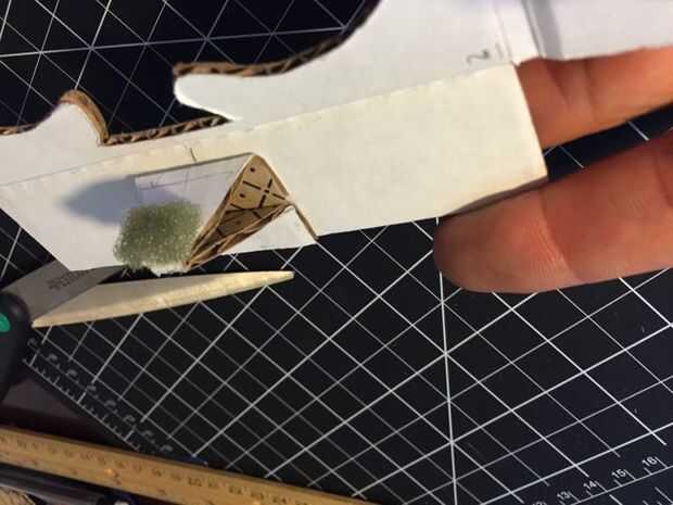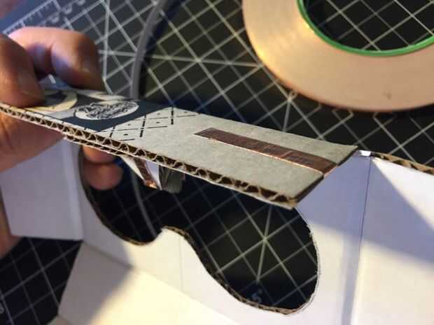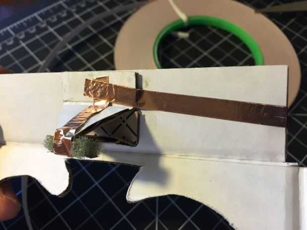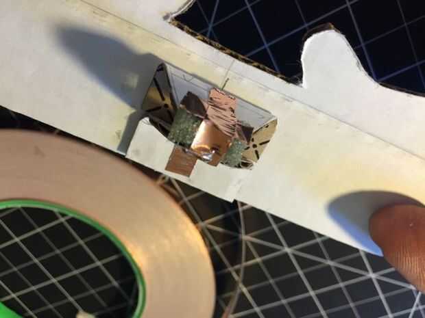 Cortar un trozo de cinta de cobre de la hoja de la anchura de la esponja y sujételo suavemente como sea posible. Luego cortar una tira de 2,5 pulgadas y abrigo por debajo de la esponja, sobre la parte superior de la pirámide a la base. (Tip: cinta de cobre es mejor manejada por pelar el respaldo que usted necesita, en lugar de todos a la vez. Tiende a rizar, arruga y pegarse a sí mismo). Luego otra pieza aproximadamente 4 pulgadas de largo y acople de la base en la parte superior de su aleta de gatillo, donde va a tocar con los dedos.