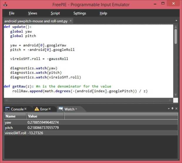 Descubrí este programa de este hilo en Meant ser visto, un foro donde VR entusiastas reunirán y discutirán. Yo no he rastreado el foro pero este hilo sobre Android y VR a FreePIE la elección para el rastreo de cabeza. Básicamente, las pistas los sensores en el teléfono, envía los datos a través de Wi-fi al ordenador que ejecuta un script que convierte los datos en acciones. Python es el lenguaje utilizado en este programa, y es fácil de aprender.