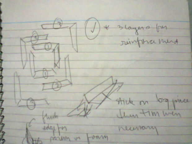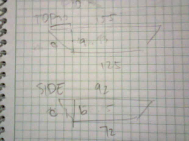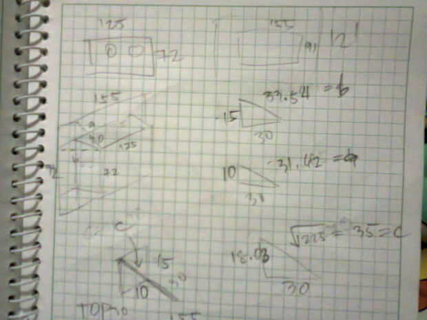 De todos modos, en las imágenes son mis planes y mis cálculos para las dimensiones. Estaba casi listo para calcular los ángulos pero entonces adiviné que yo sólo pude improvisar, y pagar un poco. No salió perfectamente pero funcionó hasta cierto punto.